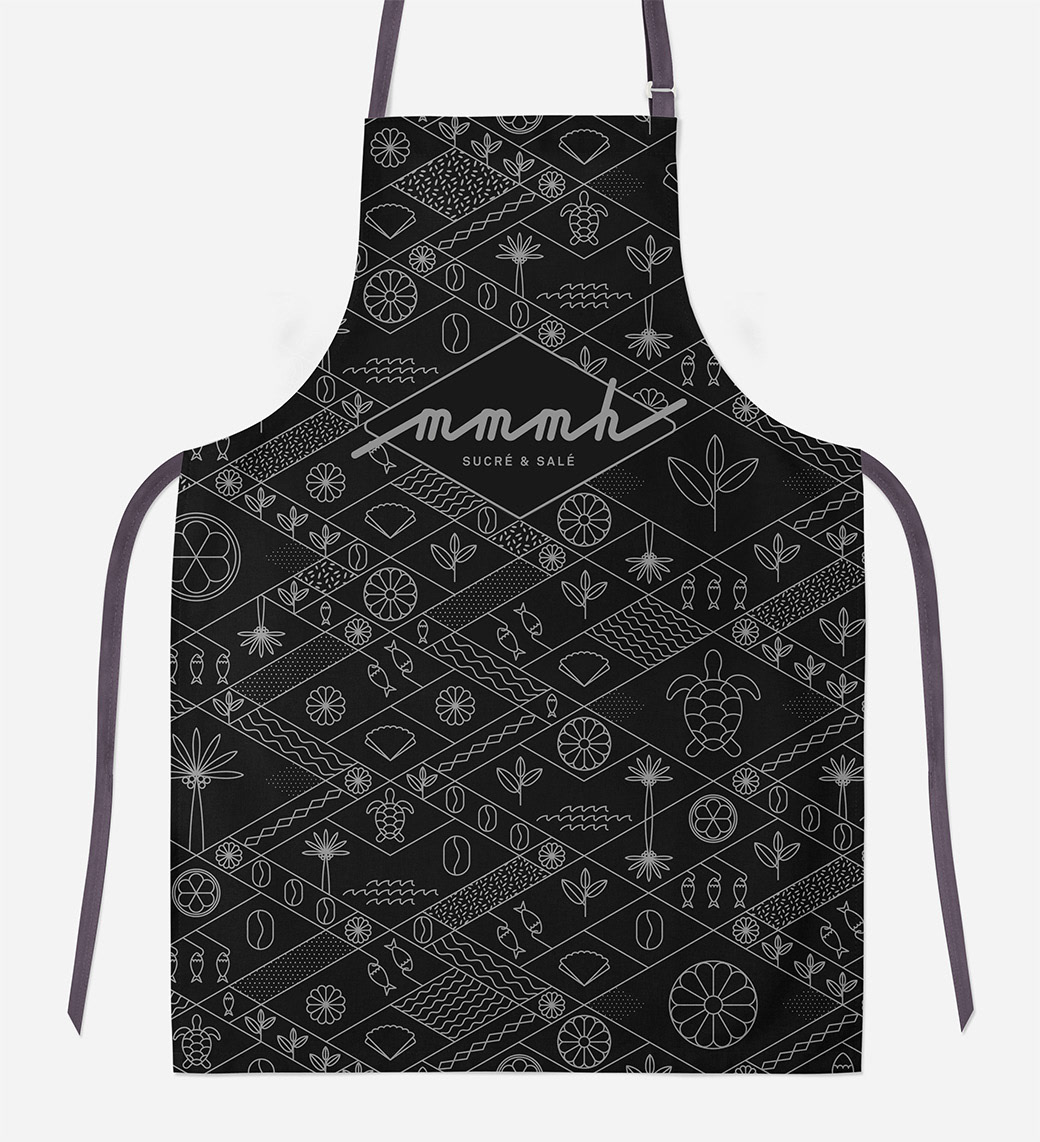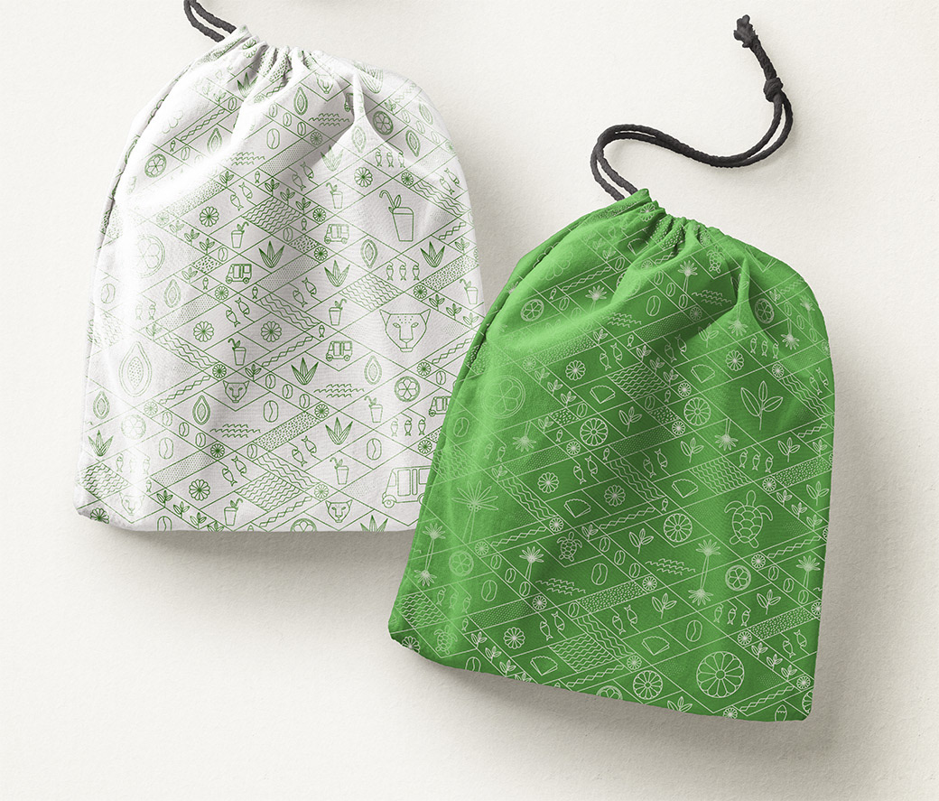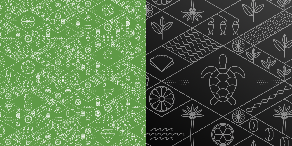 Four geometric patterns for a cafeteria based in Sri Lanka. The patterns have tropical themes -- Sri Lanka, local animals, plants, food, and tropical scenes -- and are line-based.